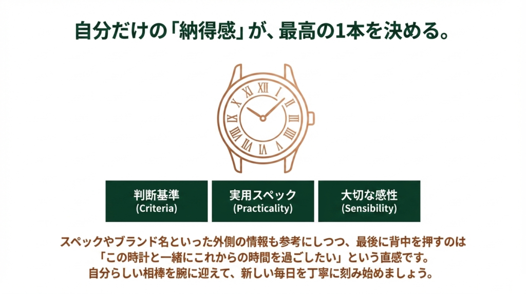 今の自分の生活を少しだけ楽しくしてくれるような、ちょうど良い距離感の時計を選ぶことが、後悔しない選び方の近道になるでしょう。