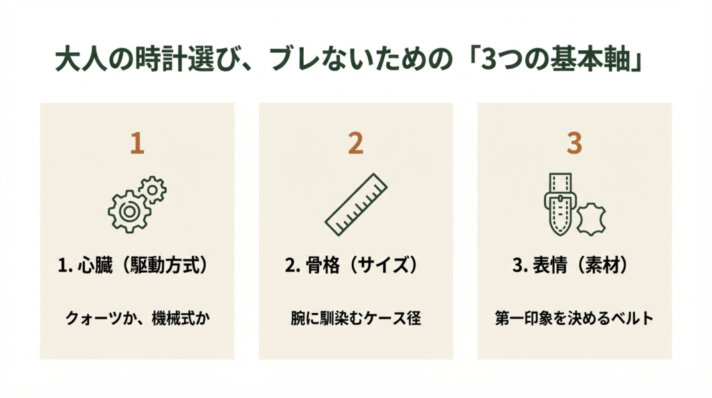 種類が多すぎて迷ってしまう腕時計選びですが、まずは基本となる軸を決めるとスムーズです。